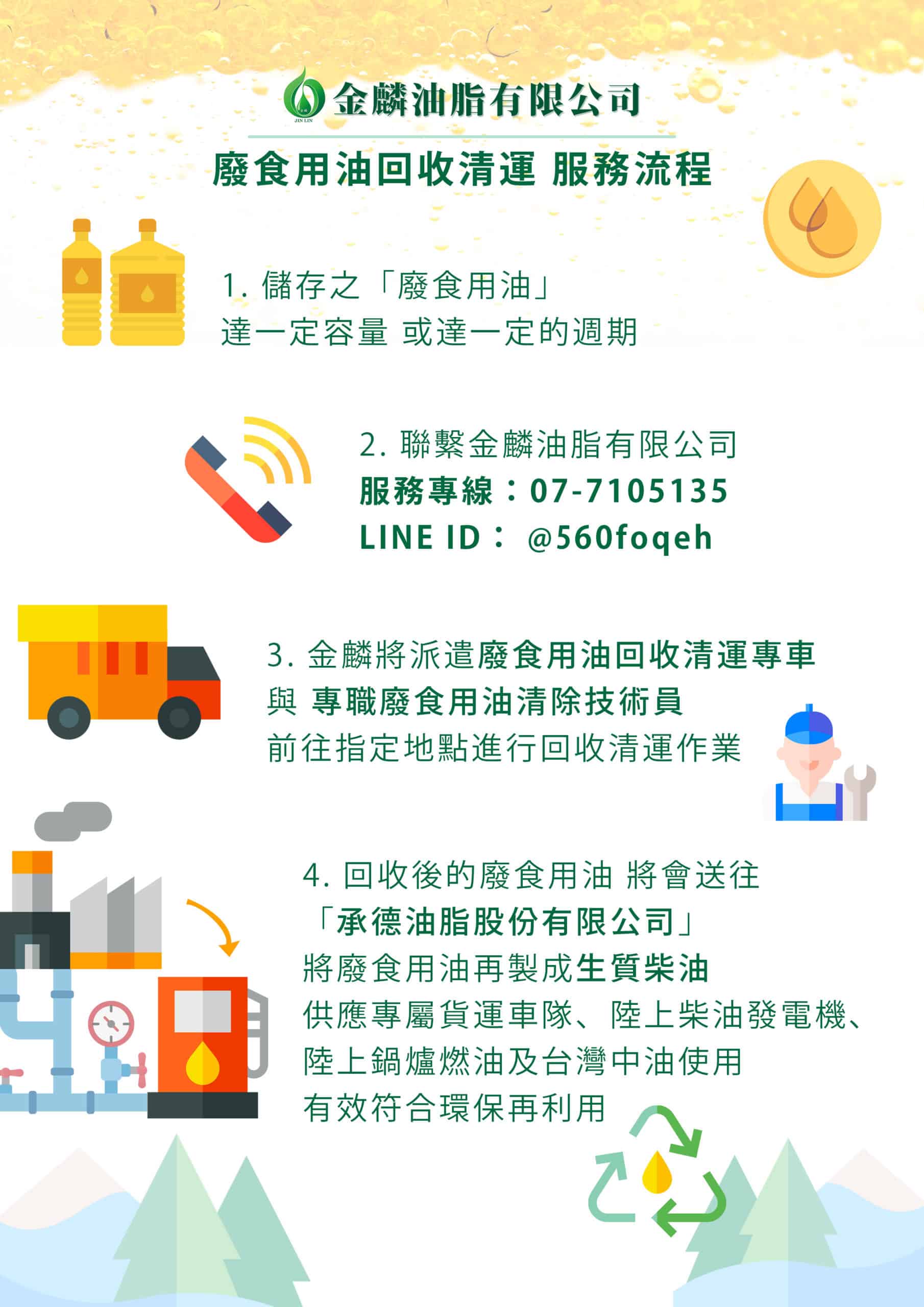金麟油脂有限公司擁有政府合法的廢棄物清除許可證,專職於南部的廢棄食用油回收清除,擁有專業廢食用油回收車隊,以熱誠服務的態度協助每一位客戶,有任何相關疑問都歡迎來電或加LINE諮詢聯絡。