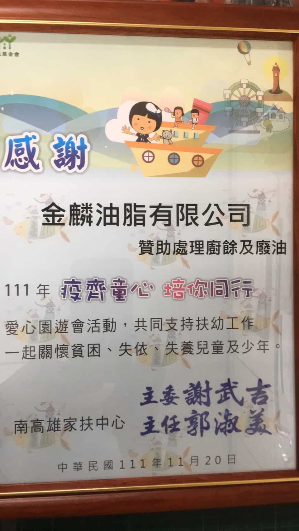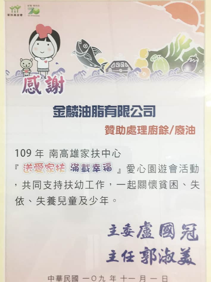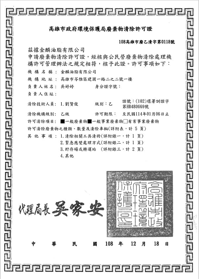 金麟油脂有限公司具有「高雄市政府廢棄物清除許可證」,專職於南部的廢棄食用油回收清除,設有專業符合環保政策規範之「廢食用油」回收車輛執行廢食用油清運作業。